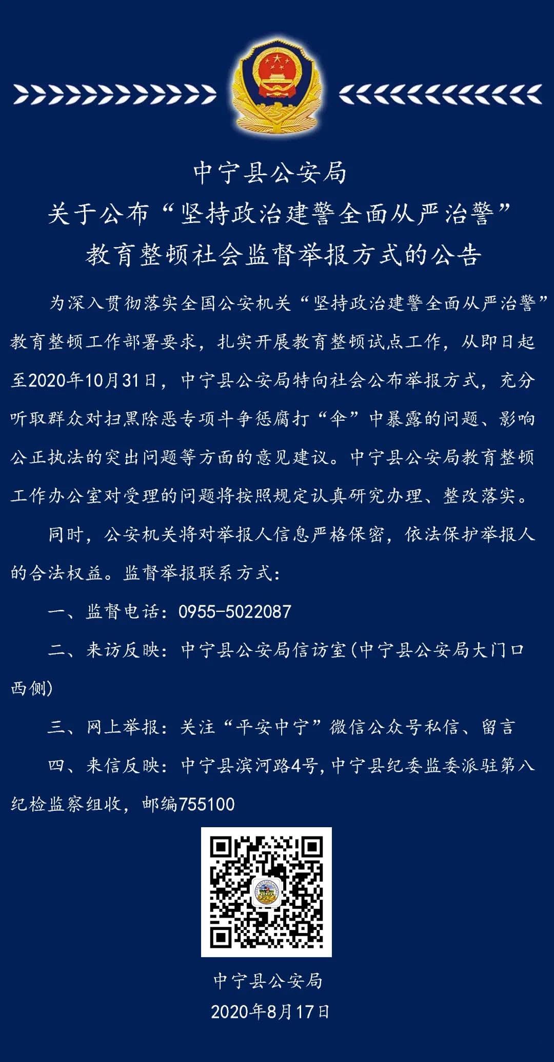 关于公布“坚持政治建警全面从严治警”教育整顿社会监督举报方式的公告