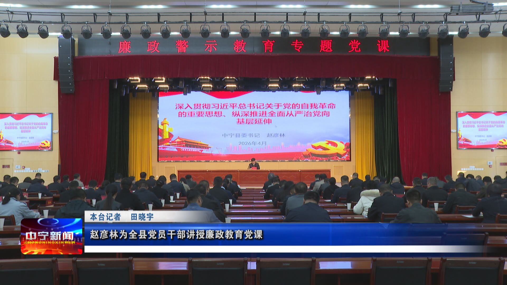 4月2日,县委书记赵彦林为全县党员干部讲授廉政教育党课,强调要深入学习贯彻习近平总书记关于党的自我革命的重要思想,扎实开展树立和践行正确政绩观学习教育,以案为鉴、警钟长鸣,紧绷廉洁自律之弦,永葆清正廉洁本色,为奋力谱写中国式现代化中宁篇章提供坚强保障。县委副书记、县长周永根,县政协主席张志军,县委副书记、政法委书记宋学强等县领导参加。